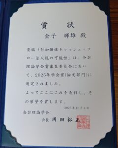 2025年10月4日~5日に本学で開催された、「会計理論学会第40回全国大会」において、本学経営学科 金子輝雄教授の「付加価値キャッシュ・フロー法人税の可能性」(『会計理論学会年報』第38巻(2024年刊行)掲載)が会計理論学会賞を受賞しました。この賞は、会計理論分野の学術的な発展に貢献する優れた研究業績に贈られる賞で、今回金子教授は論文部門での受賞となりました。